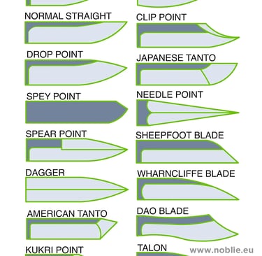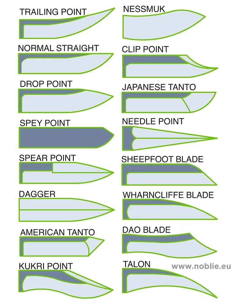 The style of the blade is the most basic element to choose when designing your custom knife. Different shapes and types have different uses, and some are more specialized than others. In addition to the style, the length of the blade is customizable as well. Feel free to email or call us if you would like more information about what blade style suits your needs best!