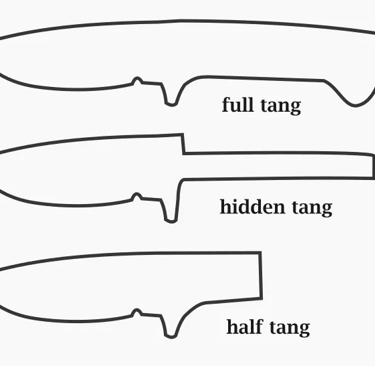 The second most basic decision to make when designing a custom knife is the type of tang. Here are a couple of the more common styles, but others exist also. The full tang offers superior strength and durability because the knife is one solid piece of steel. The hidden tang is strong, but also allows the use of bone, horn, or other hollow materials to create the handle. A through tang is similar to a hidden tang, but extends through the bottom of the handle material and ends in a metal pommel. Lastly, a slotted tang, which is common in kitchen cutlery, is a hidden tang that rests along the top edge of the blade so it fits into a slot drilled into the handle material, creating a hybrid between the full tang and the hidden tang. We would love to answer your questions and help you choose the tang style that is right for you!