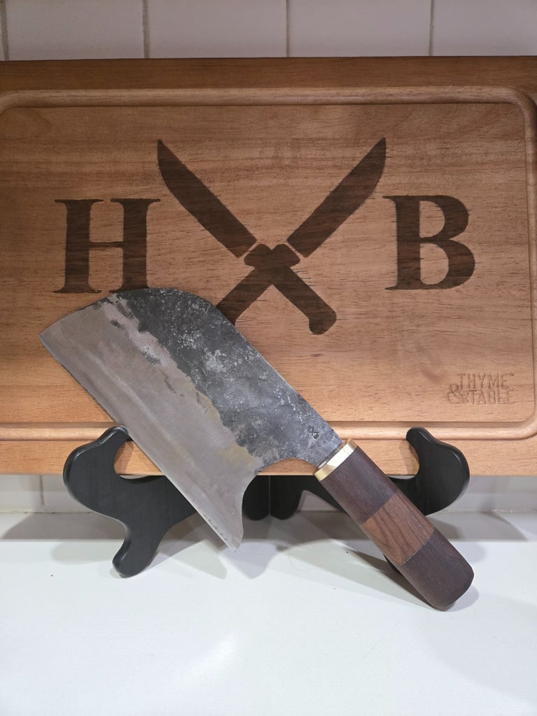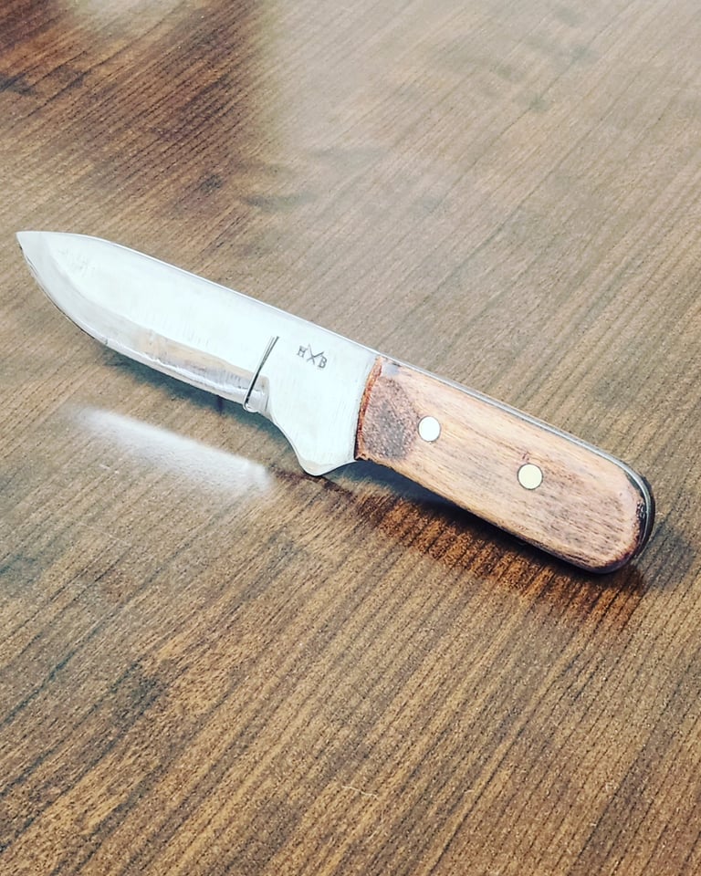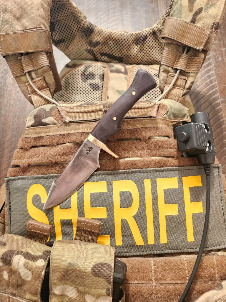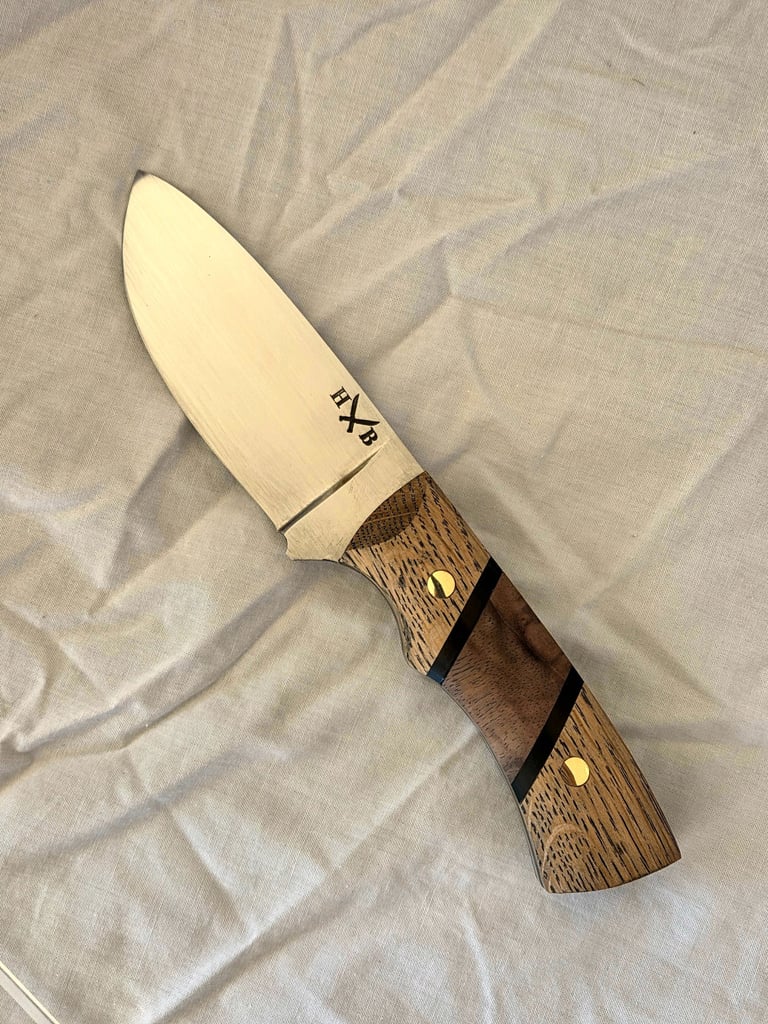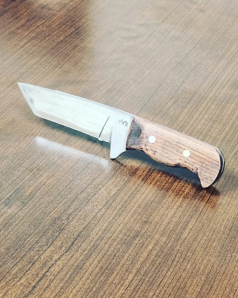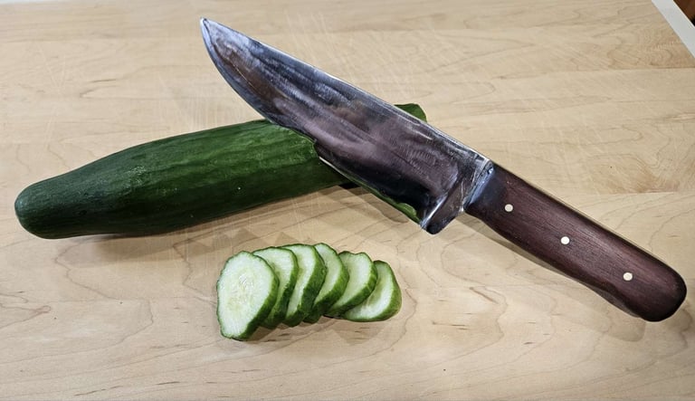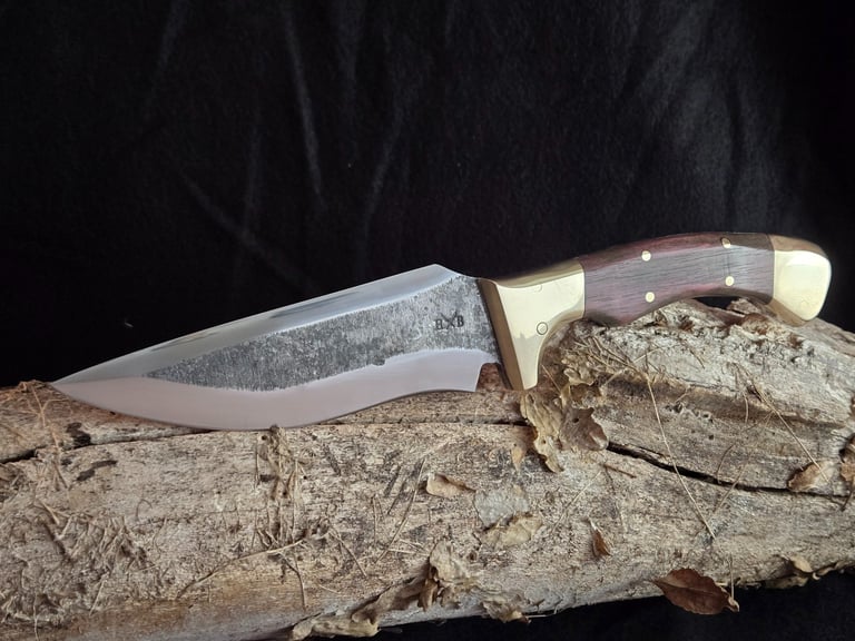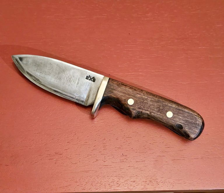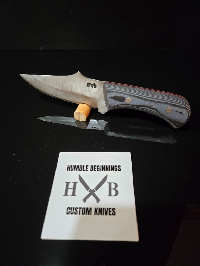 The newest member of the shop, A.J., was born in 2023. While taking time off from work to help Sara recover and to bond with A.J., Joe began watching the History Channel's hit TV show, Forged in Fire. Joe and A.J. spent many hours day after day watching, learning, and planning how they could do it themselves. In December of that year, Sara believed enough in Joe to send him to an introduction to bladesmithing class. It was all over after that. Joe was hooked, and knew he needed to start his own shop. Joe started on his first knife on his back deck with a charcoal grill for a forge, a rotary tool, and a woodworking belt sander. This humble shop was the inspiration for our name today. An old saying posits that from humble beginnings come mighty things. From the shop previously known as Humble Beginnings Custom Knives come high quality, gorgeous pieces that blend art and functionality.
